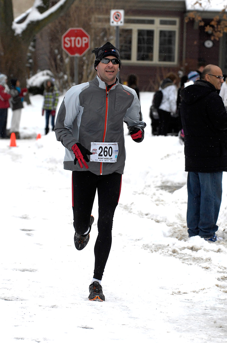 Near the end of the course, a 2nd loop (@15.5K) took us through another residential area near the lake. These roads were snow covered and slushy. I could feel myself starting to fade in this area. My legs started feeling sluggish around the 17K point, and I had to mentally focus on keeping my pace up. This loop seemed longer than I remembered it from the map, but I kept reminding myself that I was getting close to the finish. After this loop it was straight back across the QEW, and into downtown Grimsby. I was happy to be making the right hand turn to the last section towards the finish line, not realizing that it was about a 500m stretch uphill! I was rewarded at the top of the hill when I spotted my wife and 18 month old daughter who were standing in the snow and cheering for me on the 2nd last corner. Coming up to the finish line I saw the 1:24:59 click by and wished I had pushed harder over the last kilometer or two and got in under 1:25… but I was still very happy with my time in these conditions!