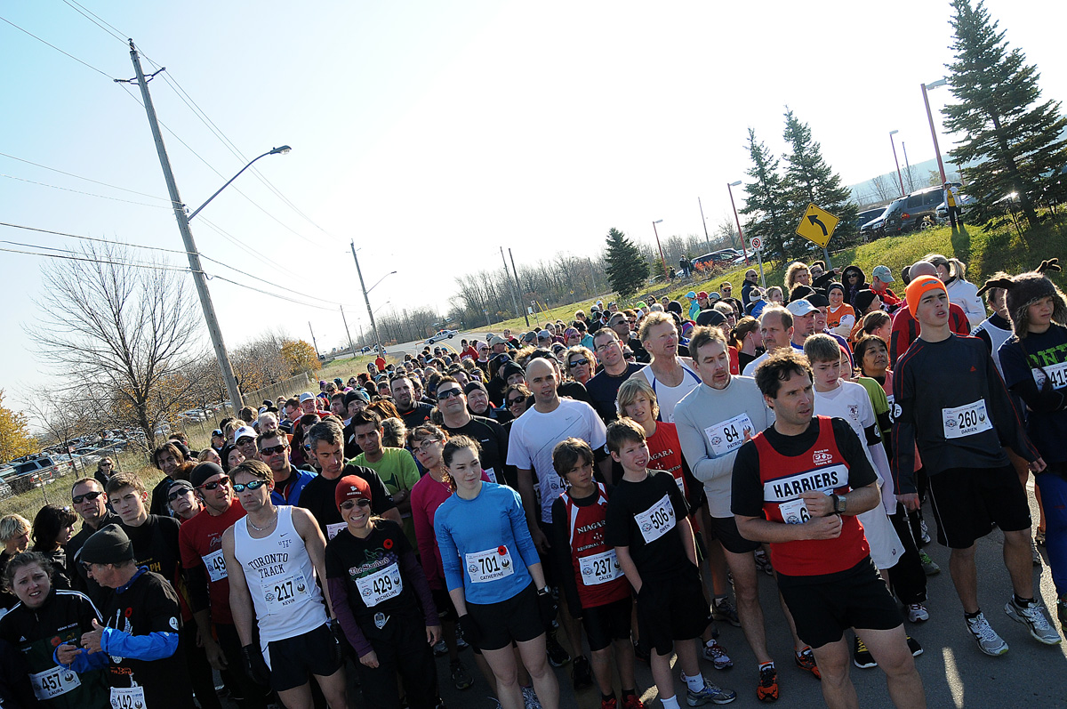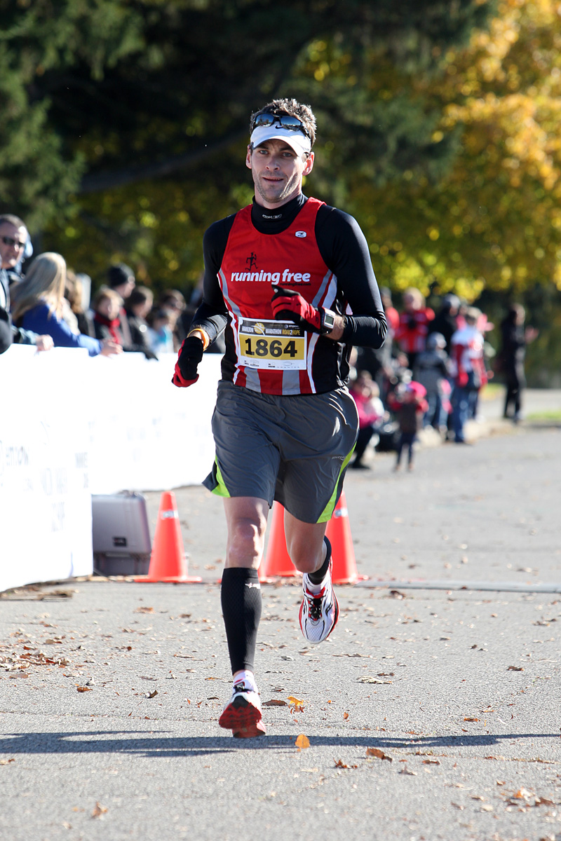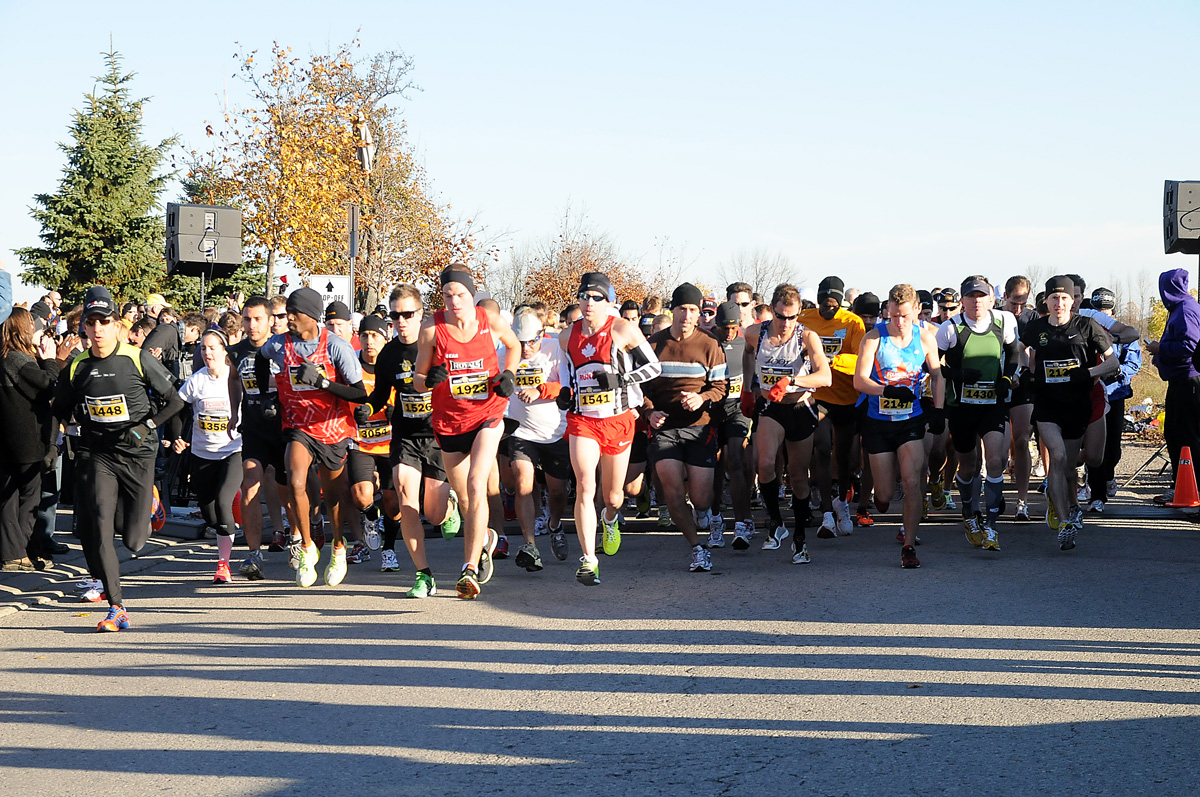 The buses took us up to the start line at a Hamilton high school. The school provided a nice indoor venue to wait until start time (along with an abundance of water fountains and indoor bathrooms.) Given the unseasonably warm November day, a popular topic of discussion was what to wear? After I made my choice I wandered out to the start area in time to watch the full marathoners head off, and then lined up for the start of the half.