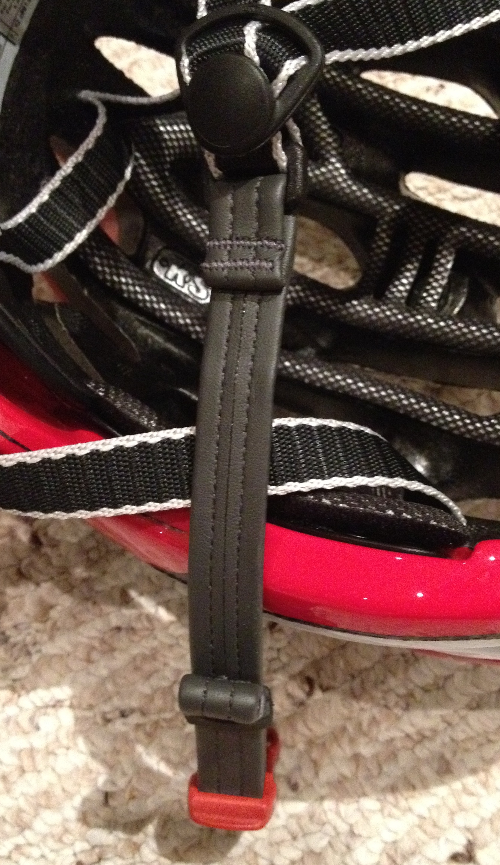 Visually, the Mojito helmet looked great – I received the red and white version.  The vents are plentiful and well placed.  It has got some cool features like a leatheretter chin strap pad that is supposed to be more comfortable than the nylon strap against your skin.  The rear suspension has an up/down adjustment which is supposed to help with setting up the best fit for your head.  The Mojito helmet feels nice and light but still seems durable enough to last a long time with daily use.  The outer shell extends over the exposed foam around the edge of the helmet which I think looks good, but also adds a bit more protection.