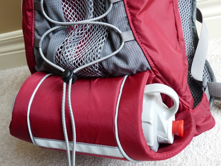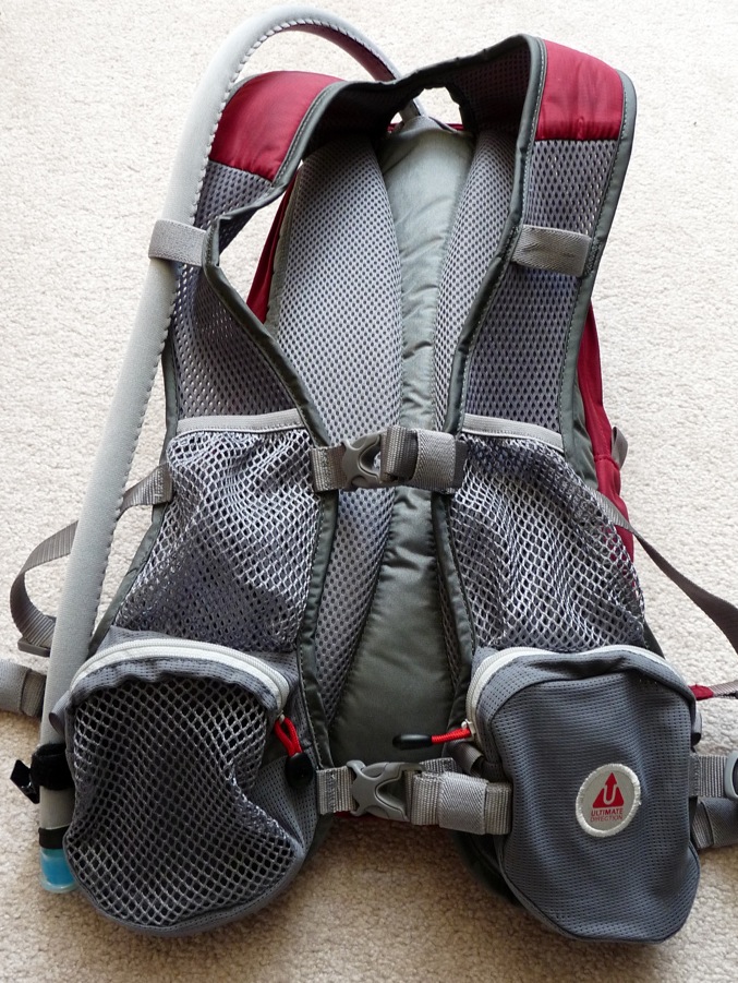 I really liked the bottle sleeve on the back of the pack. It was easy to grab the bottle (the Ultimate Direction Kicker bottle has a rigid loop on the cap that helps with this) and reinsert it when you’re done – it takes a bit of flexibility but I would think most people should have no problem accessing it. Even though the bottle just lays in the sleeve, it was well designed with raised lower edges at each side and I didn’t have any issues with the bottle falling out. I liked the option of having a mixed electrolyte drink in the bottle, and water in the bladder. One thing that would be even better would be to have a simple handheld bottle system in the back so that if you wanted to carry it for a while, you had the option of a handstrap.