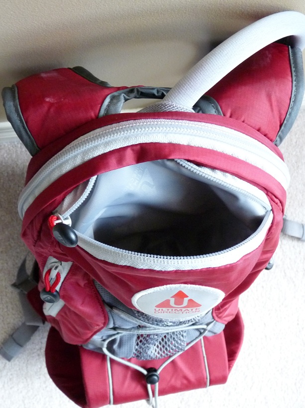 The Ultimate Direction Kicker bottle that the pack came with works really well. I have used it before in one of my handhelds and I really like the design of the lid. The valve is the unique part that can pop (or “kick”) in and out for use. When it is in, the bottle won’t leak and when it is popped out you just need to bite and squeeze the bottle to get it to flow. Even with the valve popped out I have never experienced much leakage (unless the bottle gets squeezed/crushed). I found it took some getting used to get good flow out of the valve but once I figured it out it worked great.