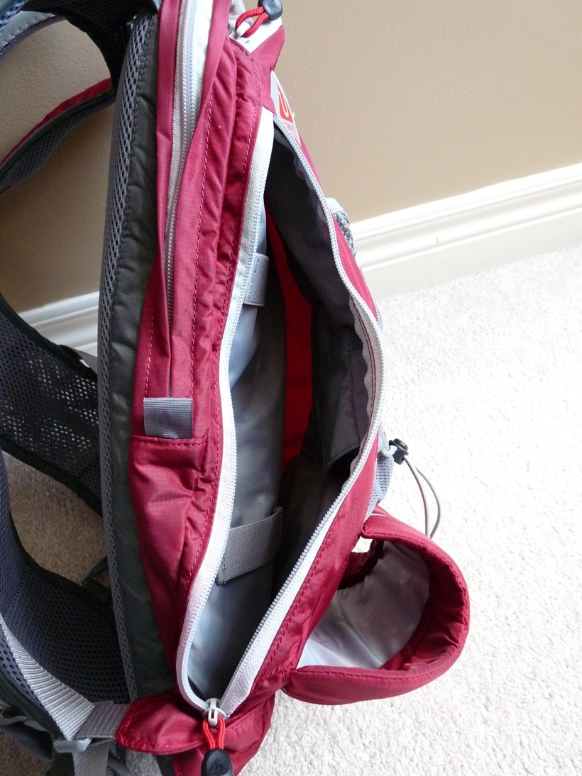 I was using the pack during the summer so I didn’t need to carry too much extra stuff, but I did use the pockets to get a sense of how it feels loaded up. There are a number of pockets with some nice organizing features built in to keep things in place. The side pocket has a small inner velcro sleeve and a couple elastic loops to keep smaller items in place. I also really liked the pockets on the front vest section – I like having access to some things without taking the pack off and the Diablo had loads of room up front for my phone/camera, some gels, car keys, ipod, etc. It also had a couple of mesh pockets with elastic openings which were perfect to stuff my empty gel and bar wrappers. I also loaded up with lots more water than I needed and found the Diablo pack handled the weight well.
