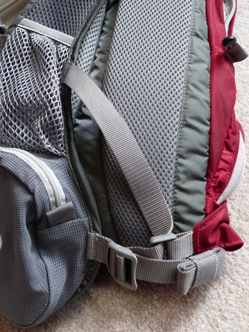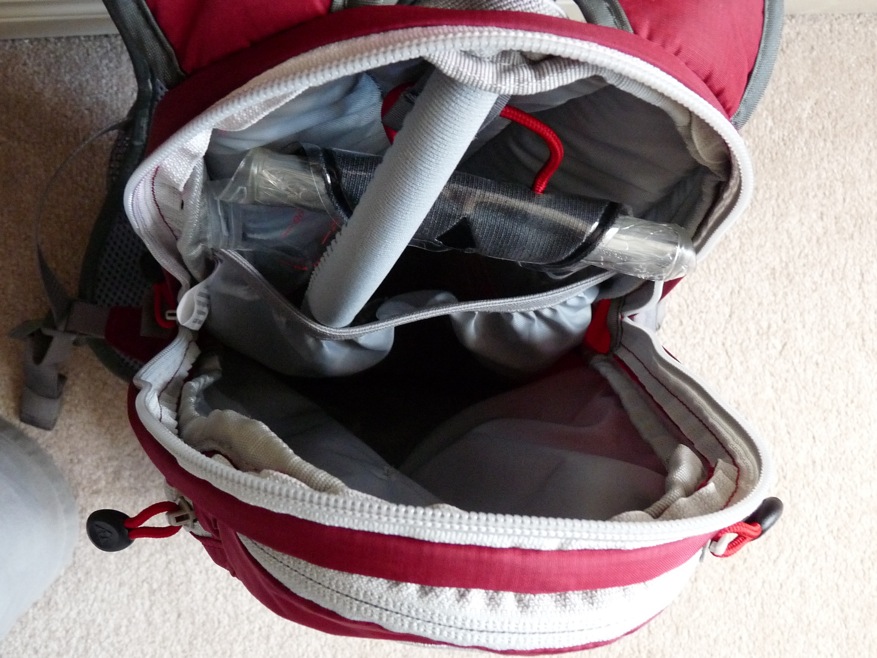 I was impressed with the fit of the pack. It is a vest style which I have found to really work well in the larger packs I have tried. It has got some simple adjustment straps that allow you to customize the fit to work for you. I found it easy to make a couple of quick adjustments once I had the pack on and it was a good fit. The way the weight sits low on the back of the pack (from the water bladder and bottle) made it balanced so that I didn’t have to keep the front super tight and constricting. The vest stayed in place while allowing me lots of room to breathe and be comfortable.
