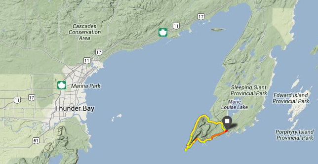 Recently I was back in Thunder Bay for a visit and made a (loose) plan with my brother and a good friend to do a trail run around the whole Giant. Despite weeks of discussion, it wasn’t until the drive out to Sleeping Giant Provincial Park that we finally nailed down our route – we would begin at the Kabeyun Trailhead, head west to Sawyer Bay, then south along the shore of the Lake, before traversing over the feet, and heading back to the trailhead along the Kabeyun Trail. I roughly estimated this at 25-30km which would work well (we hoped) for all of us.